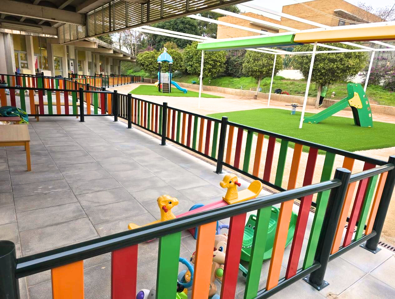 Para garantizar la seguridad del entorno, se ha instalado una valla metálica homologada con separación de lamas inferior a 7 cm, cumpliendo con las exigencias de la normativa vigente y especialmente adecuada para escuelas infantiles y centros educativos.