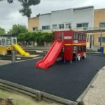 Juego Infantil El Bus del Colegio para parques infantiles de exterior. Formado por toboganes, plataformas, paneles lúdicos y estructuras de trepa.